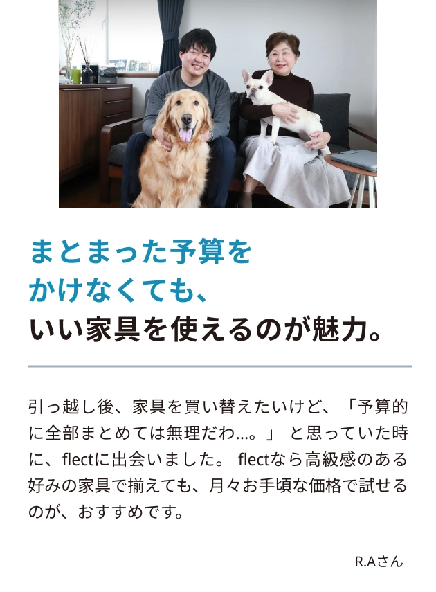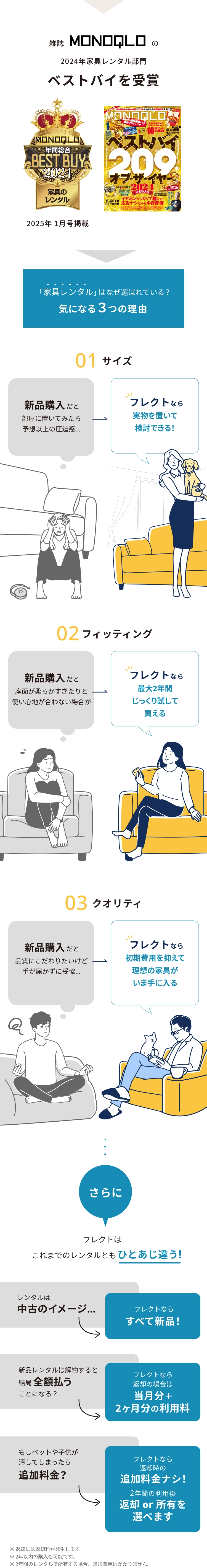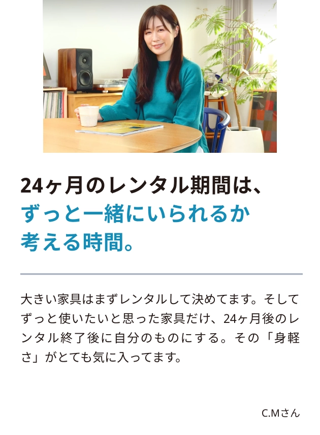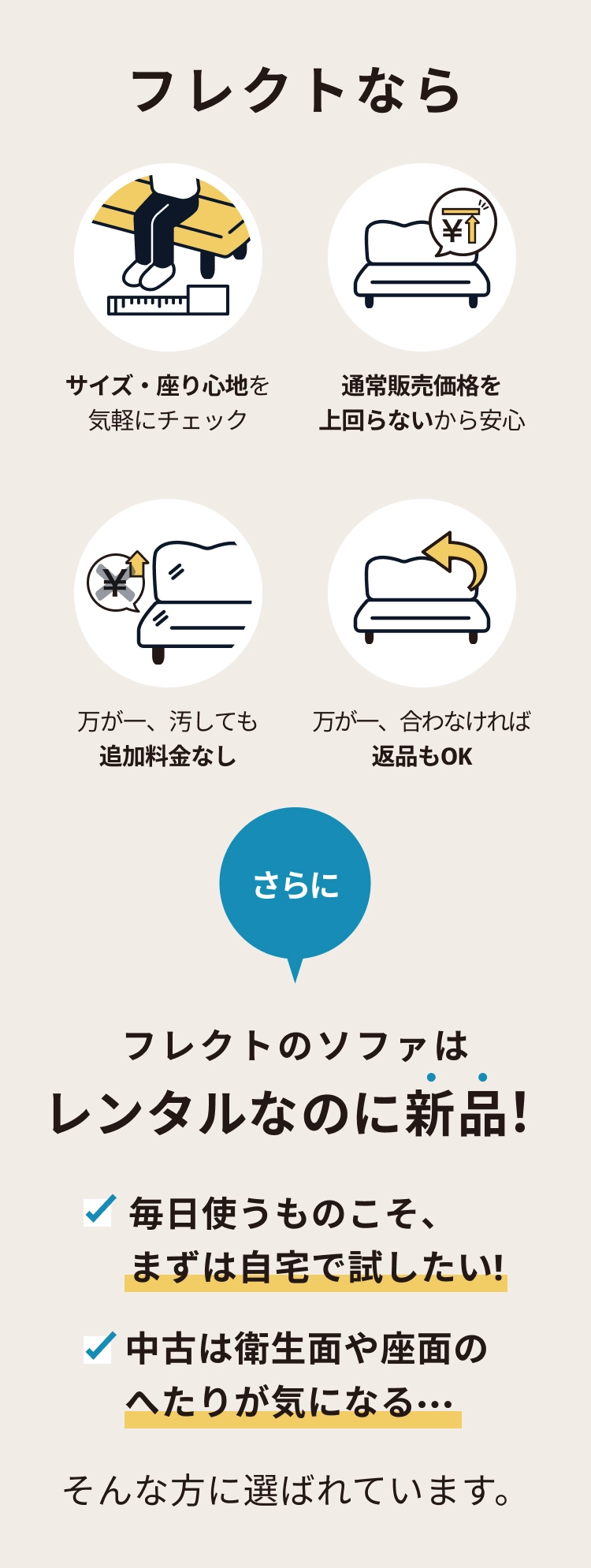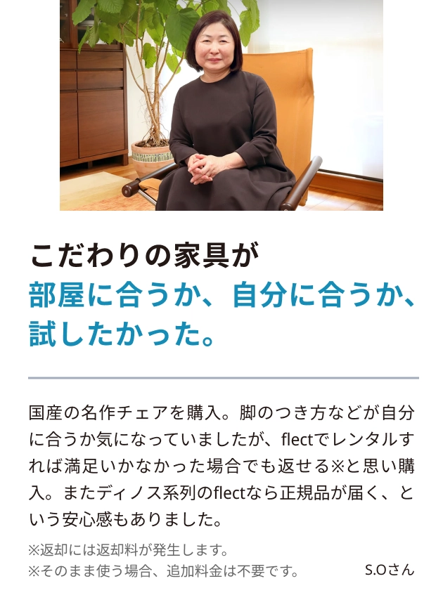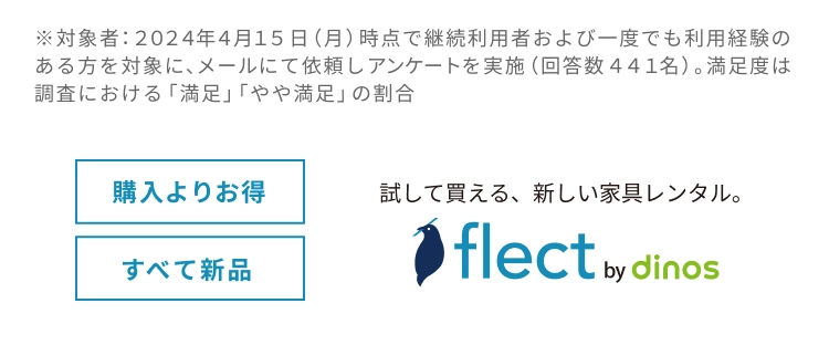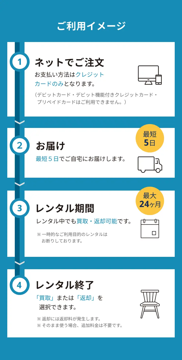 最低利用期間は3ヶ月です。※商品お届け月に中途解約をお申し出いただいた場合の最低利用期間です。※中途解約(返却)には、お申し出月の月額利用料+2ヶ月分の月額利用料がかかる為、最低でも3ヶ月分の月額利用料を頂戴いたします。例)ご利用10ヶ月目に中途解約をお申し出いただいた場合は、12ヶ月目までの月額利用料がかかります。尚、flectは実際にお試ししながらじっくり検討できるサービスです。短期間利用を前提としたご注文はお受けいたしかねます。
