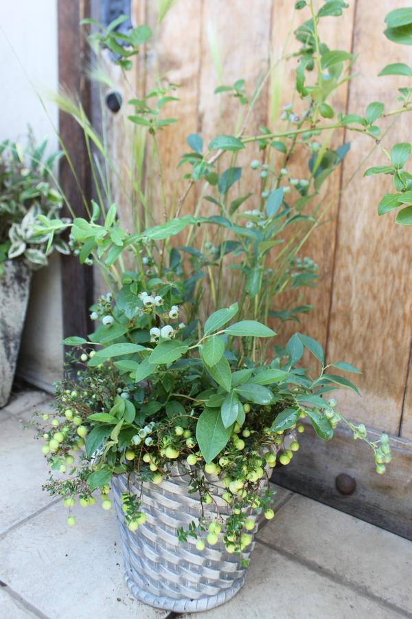 ブルーベリーの寄せ植えは、酸性土壌を好むイネ科、ツツジ科のような植物を、吸水したピートモスを混ぜ込んだ培養土で植えました。