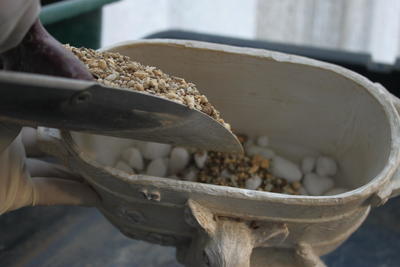 鉢底石はプランターの大きさや深さから、鉢底ネットが隠れる程度に少なめに入れます。![]()