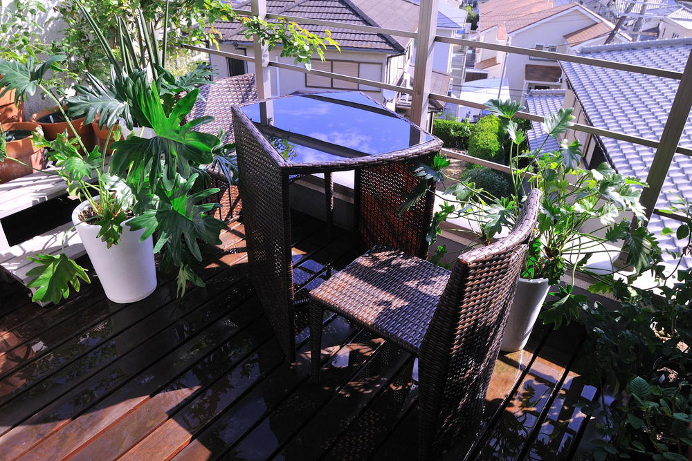 バルコニーには、観葉植物を置いていますが、観葉植物の艶やかな葉と、ラタン調の凹凸のある織り込まれた表情が、とても相性が良いです。