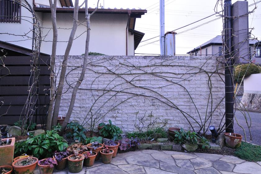 開花時期より遥かに長い、枝だけが見える風景をどれだけ美しく見せるかが、我が家の誘引の妙です。