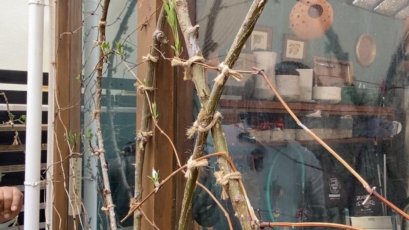 開花前のほぼツルだけの状態で、その誘引の様子をご覧いただこうと思っています。