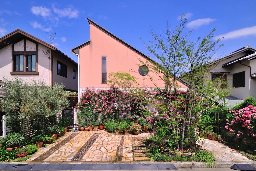 画面右側の玄関アプローチの壁面にも、ピンクのつるバラを使って「壁庭」をつくっています。