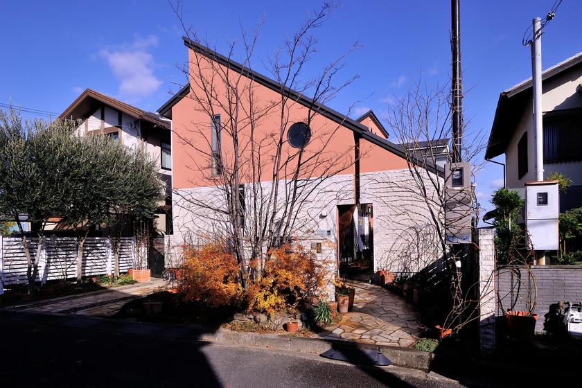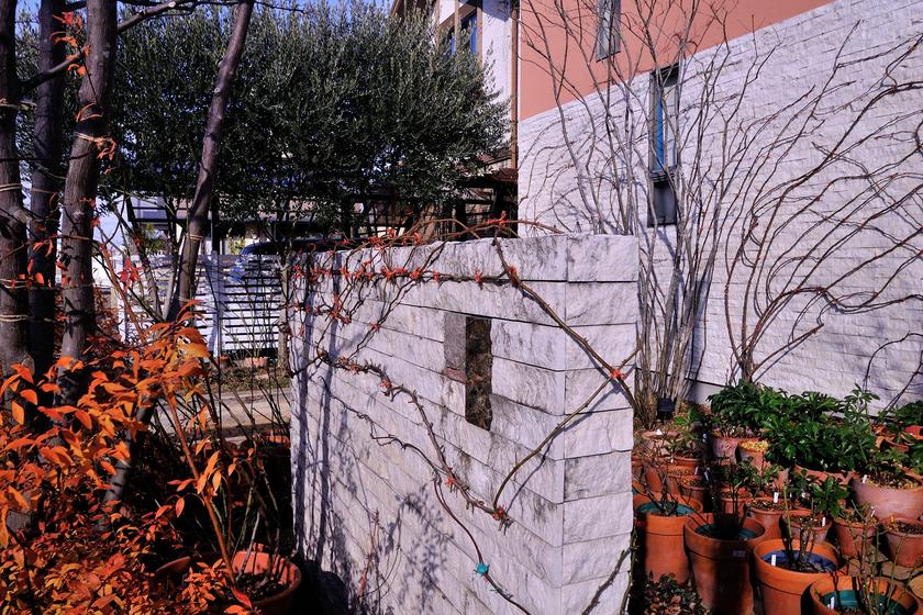 建物と同じ白い割り肌調の大理石タイルを張っている塀までが我が家の敷地で、