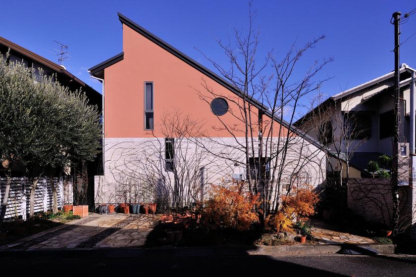 玄関アプローチから、建物の外壁1階部分の白い大理石タイルの部分に誘引した、