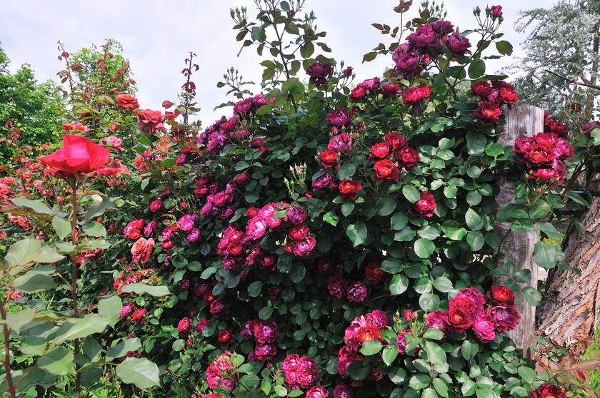 このエリアでは、赤いバラが、ピンクのバラ、アプリコット色のバラなどの間を縫うように、