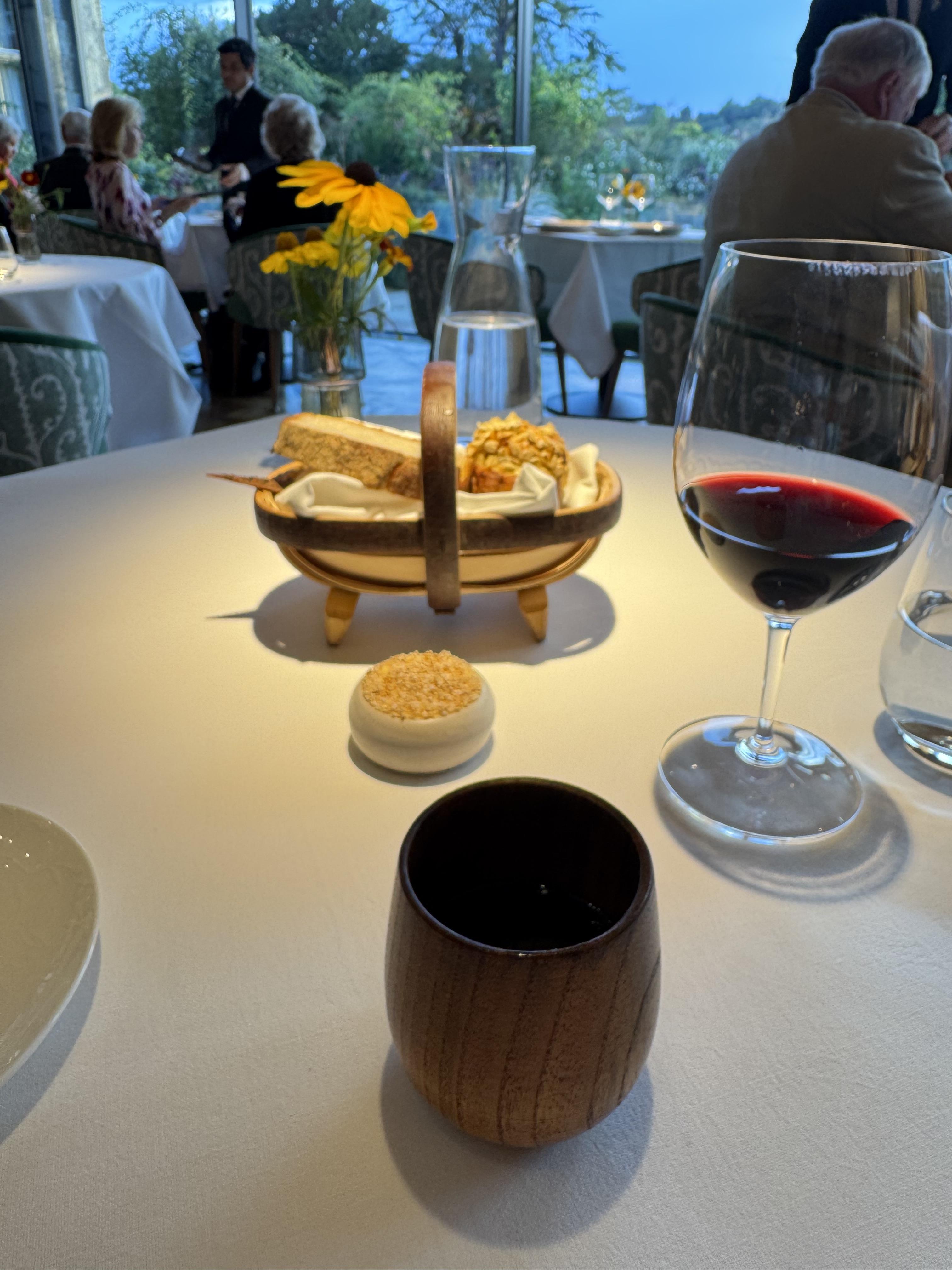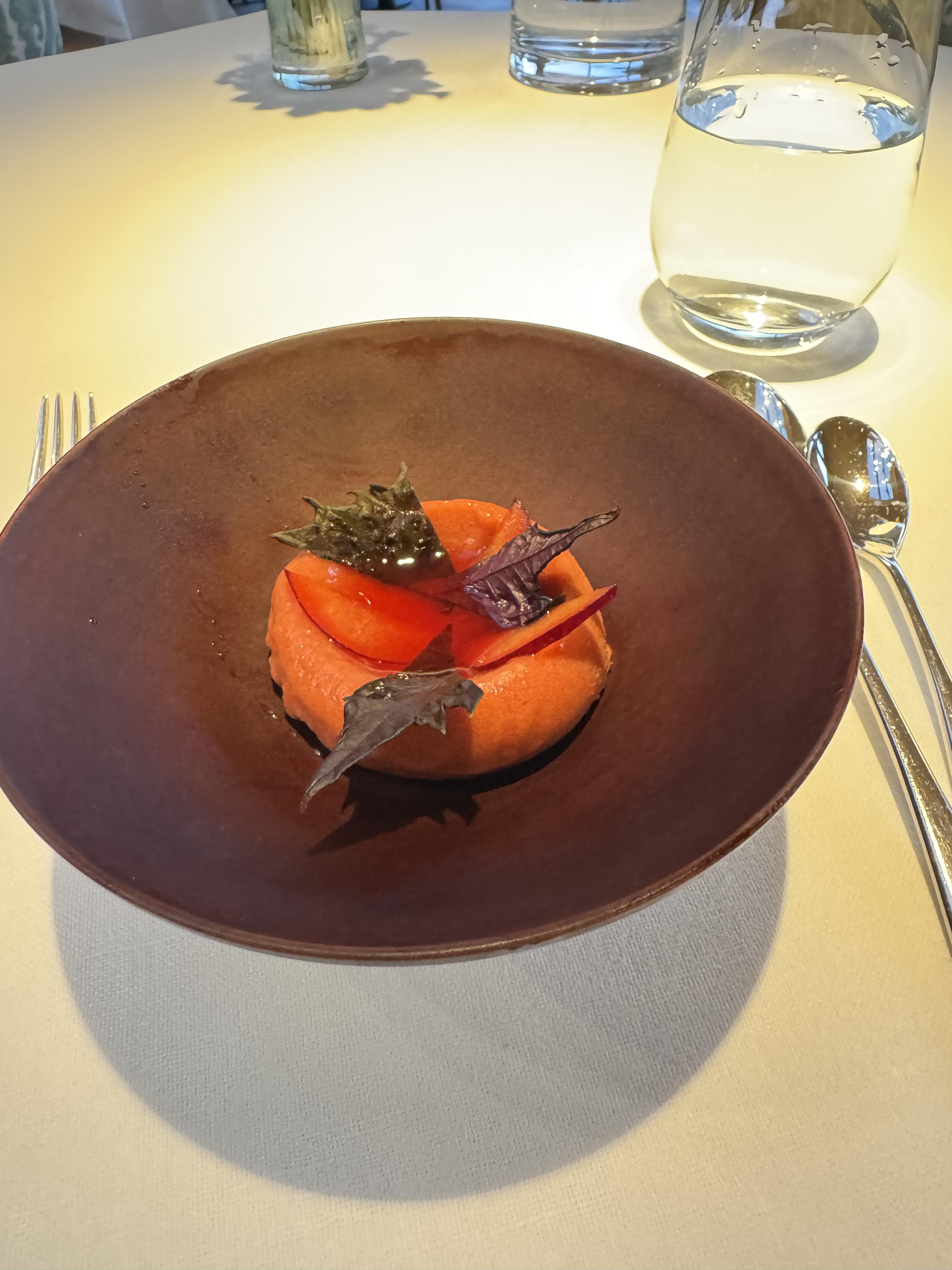 アミューズの次に出てきた トマト・ティー。ノックアウトでした大概の人がこのトマトティーでノックアウトさせられます。ちょっと日本のお茶のムードで。