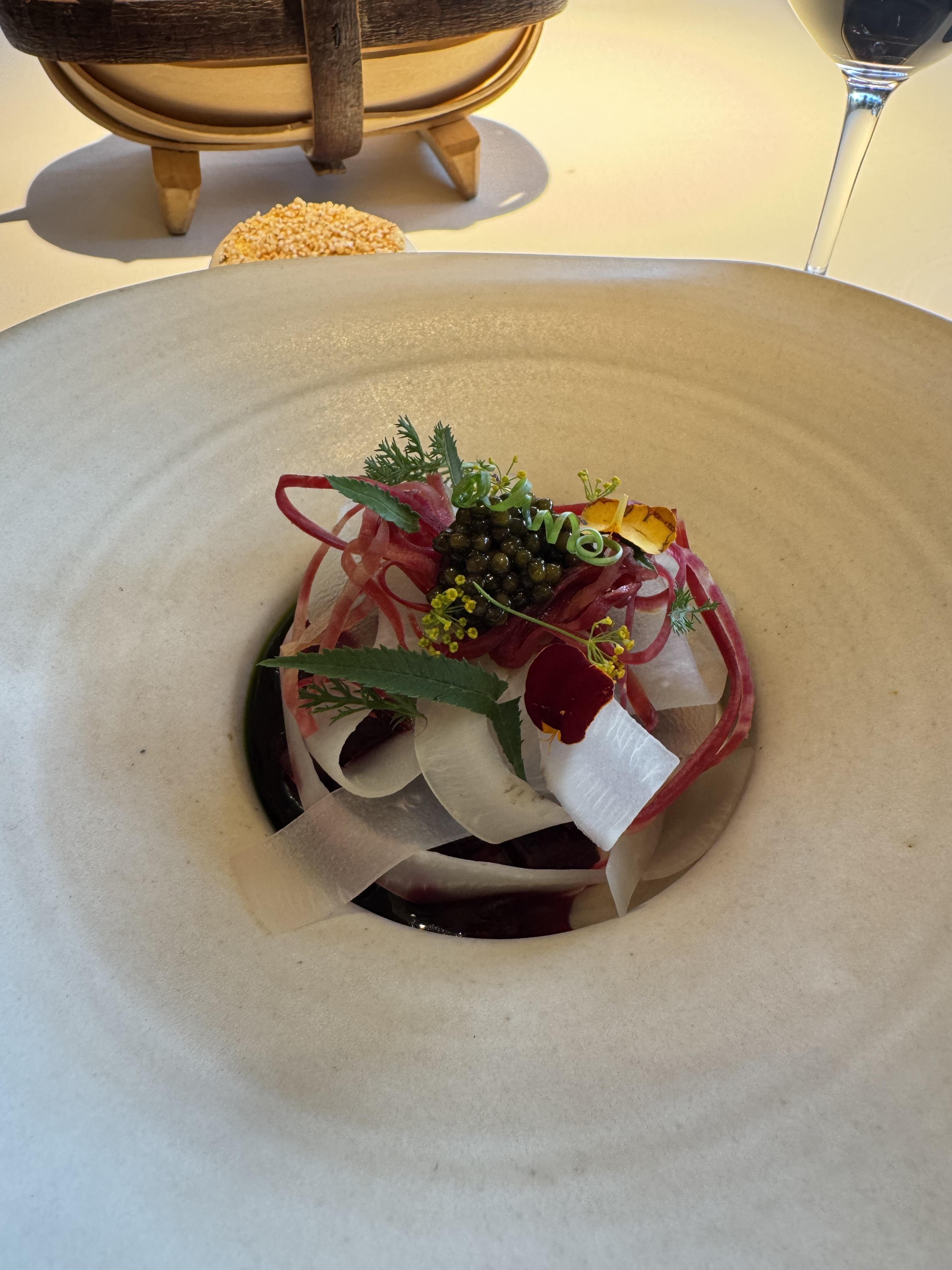 ビーツのシャーベットでお口直し。こちらも赤シソ入り!ビーツと赤シソ!そしてプラムの薄切り。