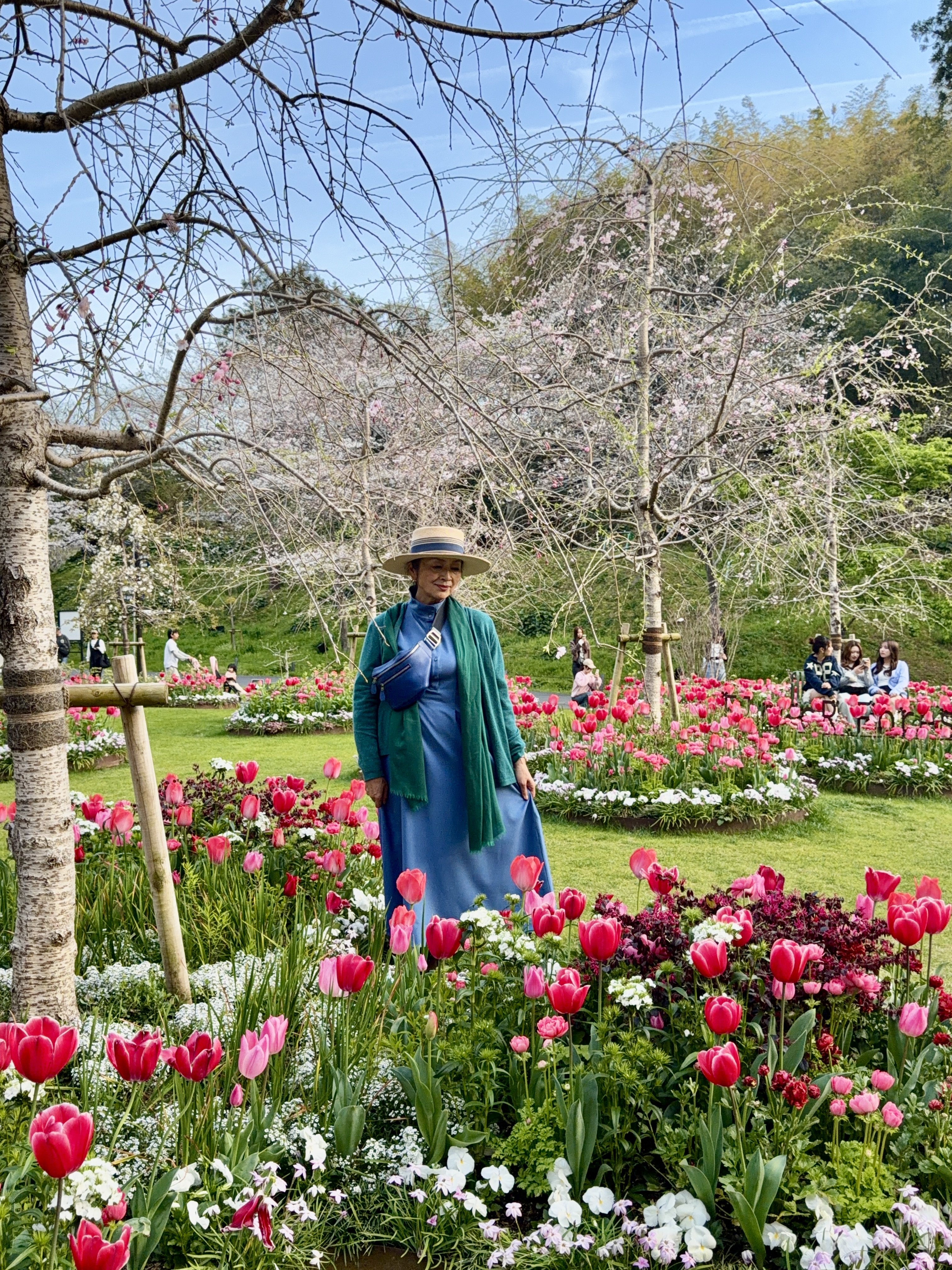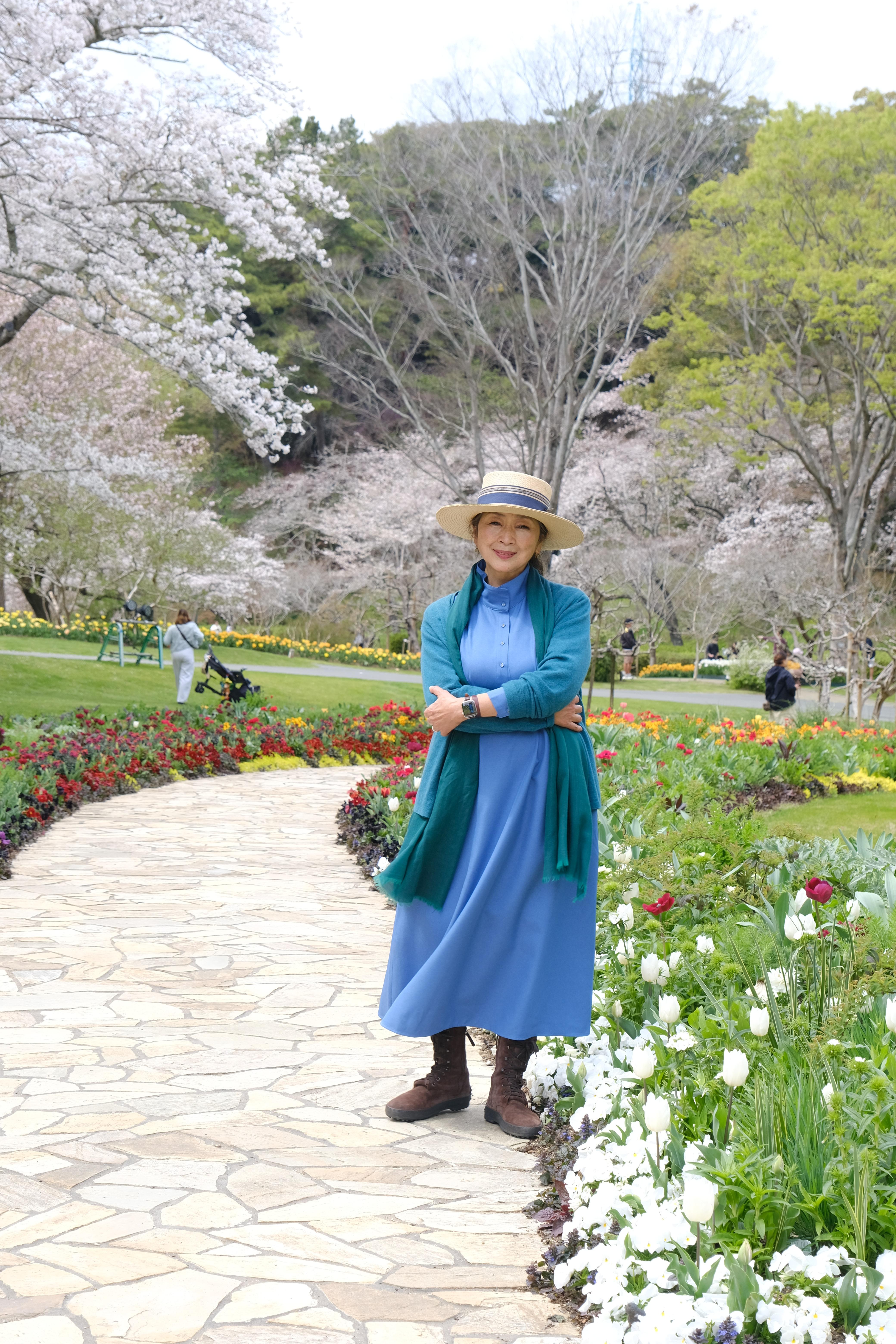 福岡フラワーショーのラベンダー色に続いて、ブルーのワンピースを着て桜が満開の