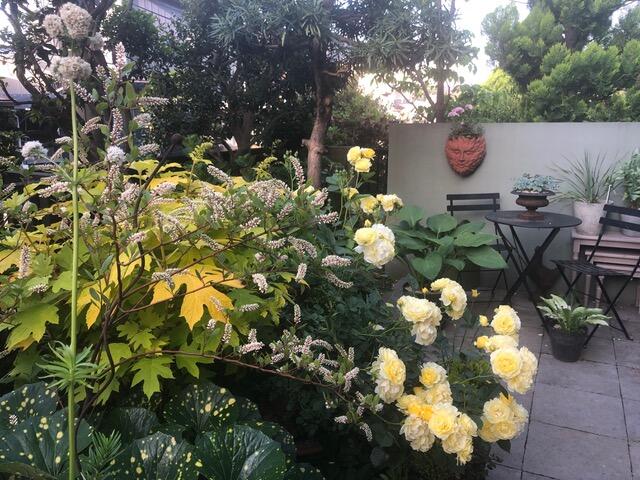 バラは、ゴールデン・ボーダー。丈夫さが取り柄の。背景に見えている黄金葉カシワバアジサイの手前に植るべくここで咲く。