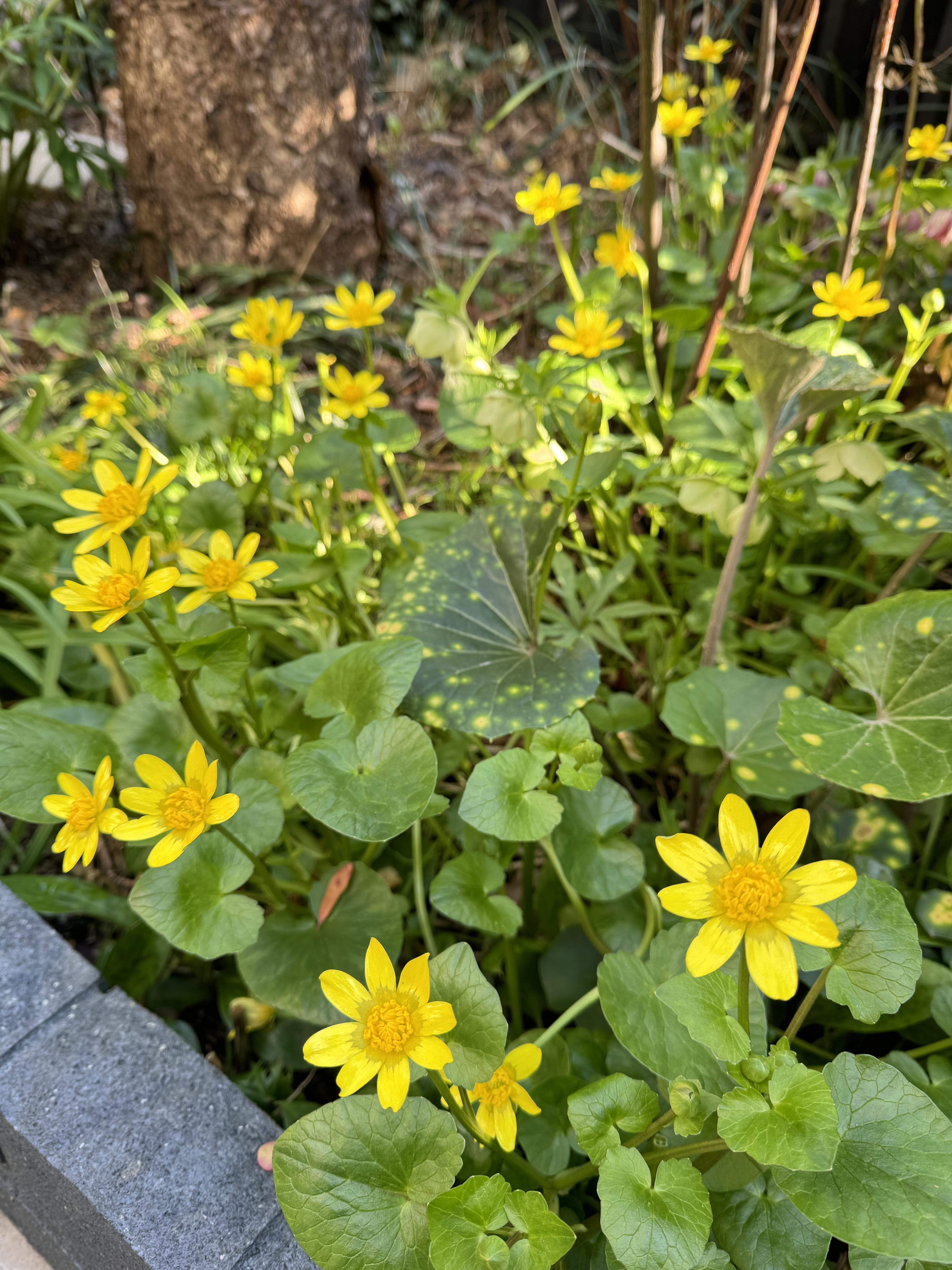 この写真は、今の私の庭。今、ヒメリュウキンカが満開です。