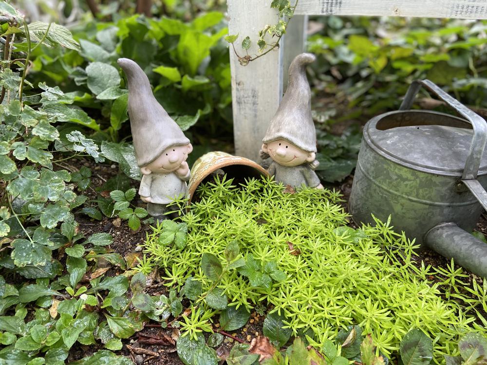 その横のイエローグリーンのキラキラした葉はセダムです。