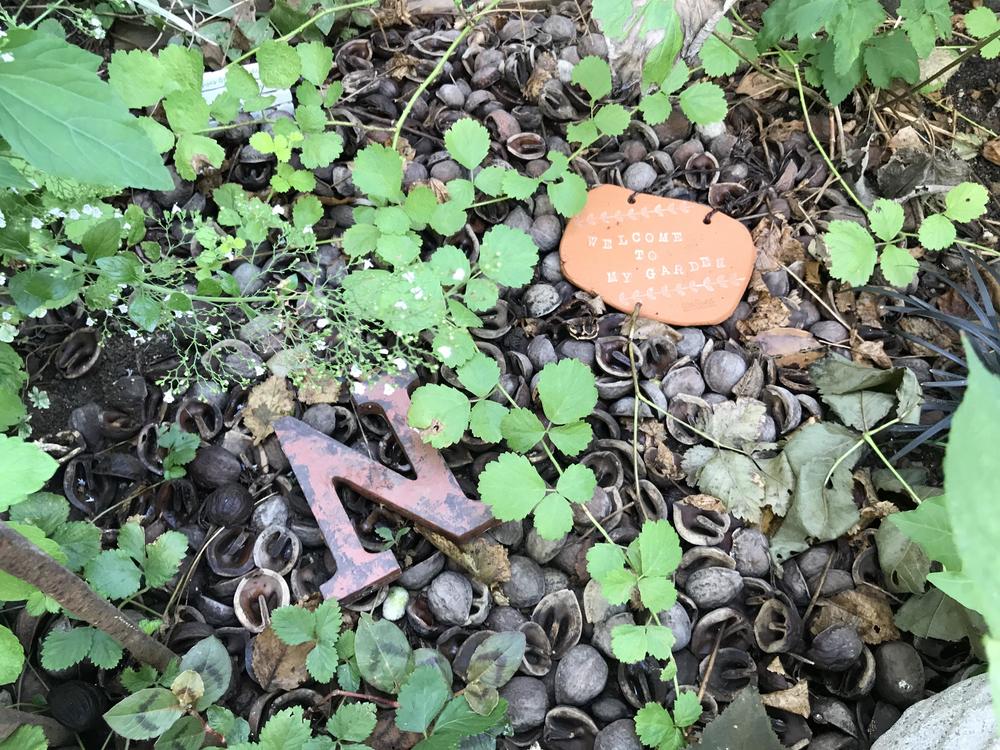 クルカラ(胡桃の殻)を敷いた上にイニシャルプレートやテラコッタのプレートを置いてみました。