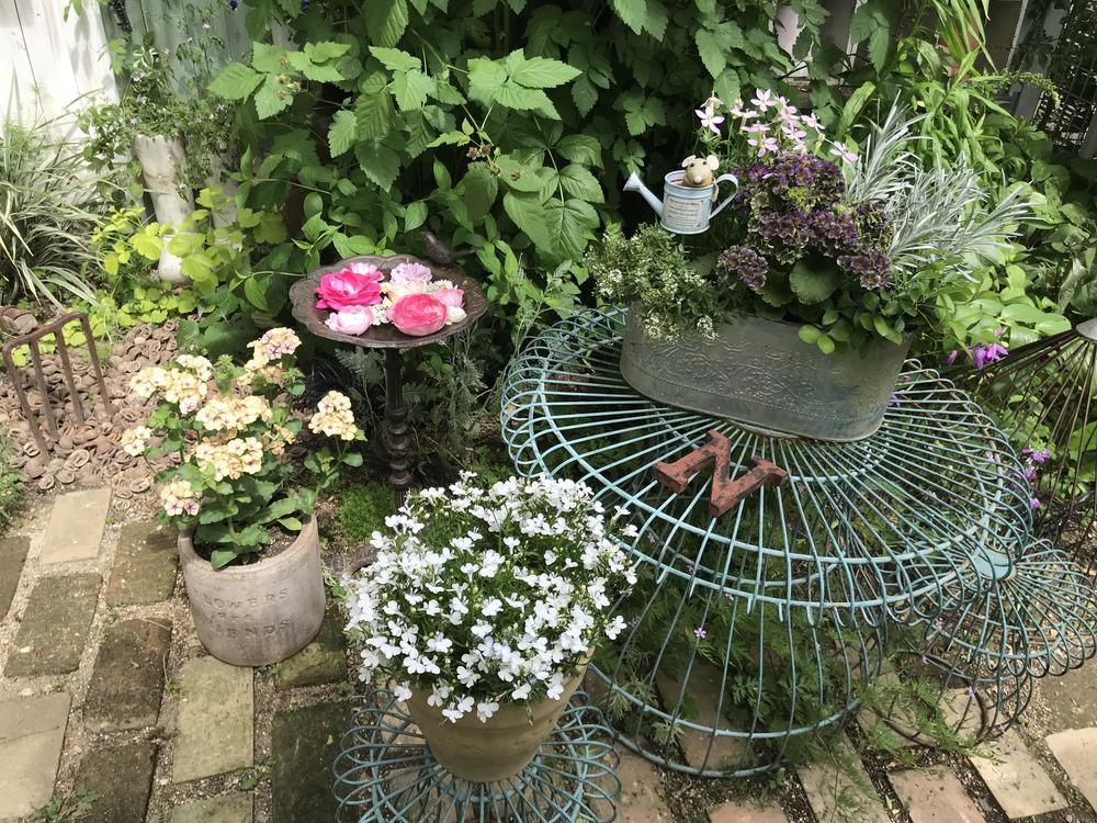 小庭はホワイトを基調にブルーやベビーピンクなど優しい色の花を差し色にしています。