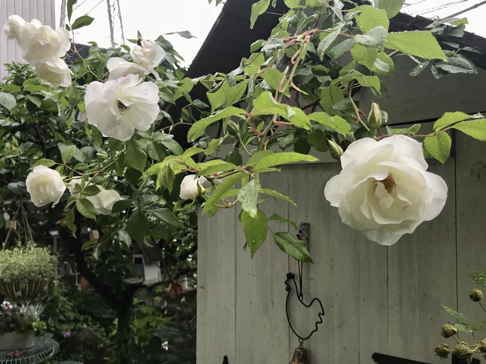 小屋に誘引したツルバラ「アイスバーグ」雨の日なので少し暗いですけど・・・
