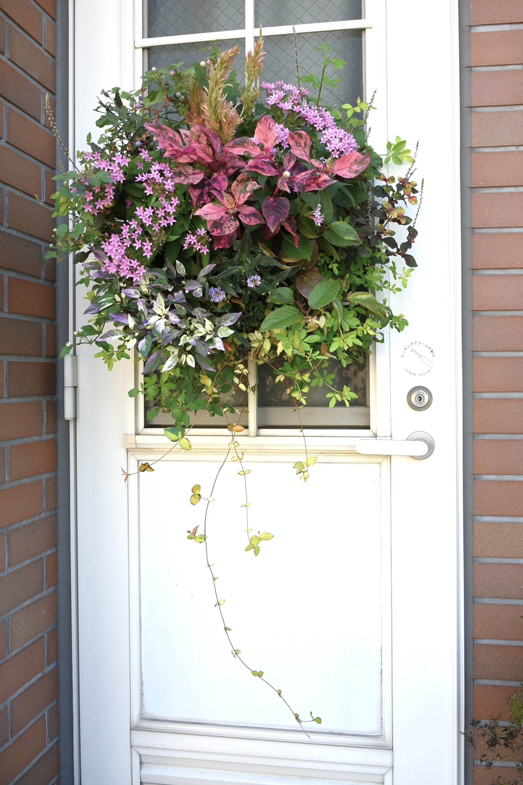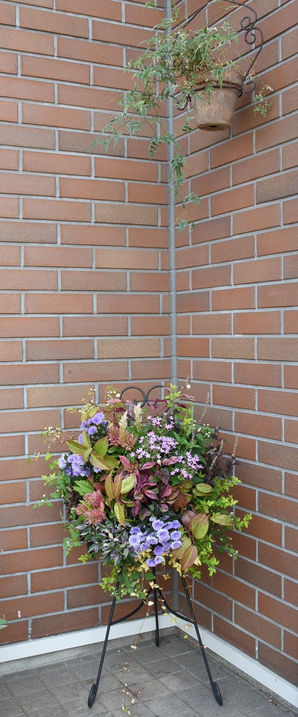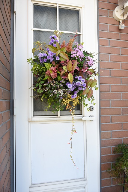 8月末に作ったハンギングバスケットです。エレガンスバスケットという、横植えできる少し大きめなバスケットに18ポット植えました。重いので、ハンギングバスケットスタンドに掛けて玄関ドア横に置いています。