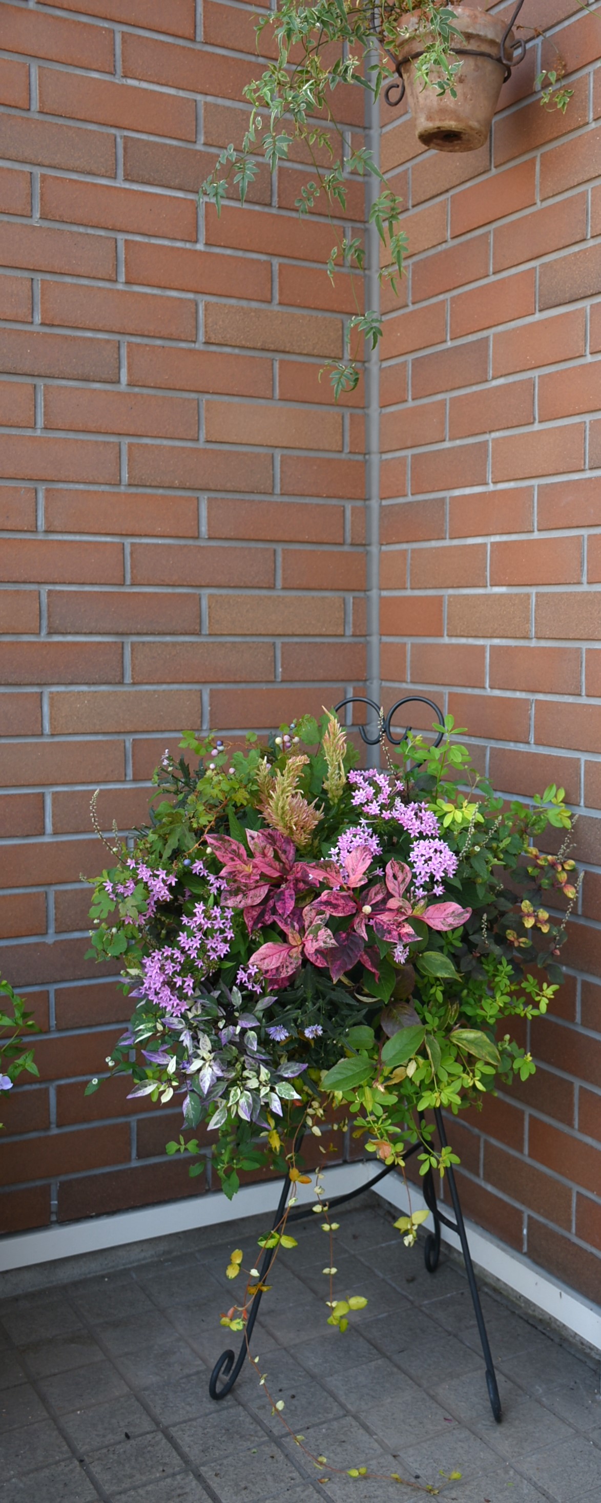 こうなりました。アルテルナンテラが育ち、ペンタスを加えたことで、ピンクの分量が多くなっています。こんなふうに変化を楽しむことができるのも、ハンギングバスケットの魅力のひとつです。