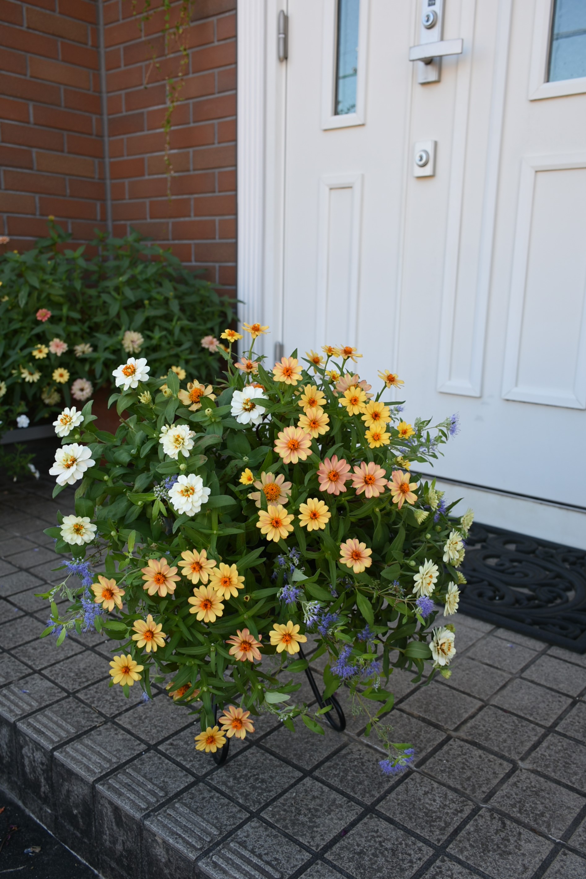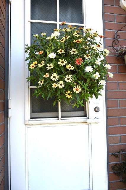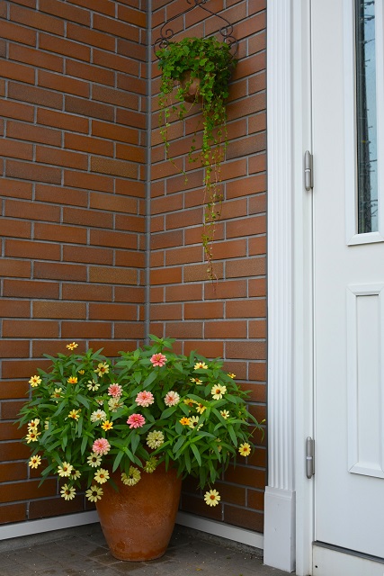 こちらは昨年の秋の寄せ植えのジニアです。冬前まで華やかで手入れも楽でした。こんなふうに3ポットくらい同じ苗を植え、大きくなったら玄関ドア横などに移動するのも楽しいです。