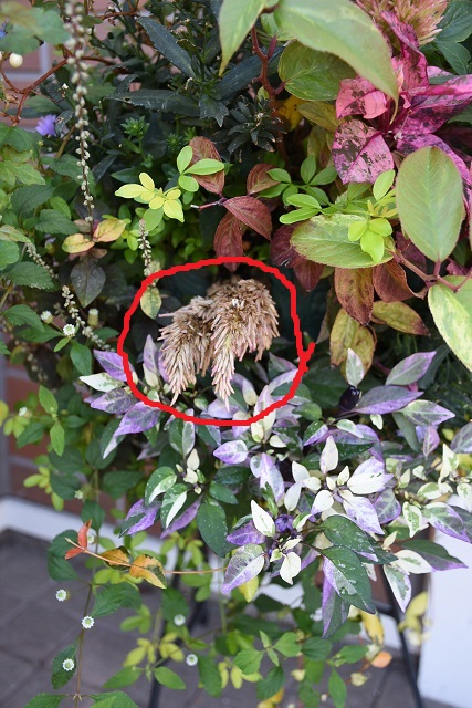 半月経って、左下に植えたセロシアが暑さと蒸れで色が変わってしまいました。このままですと、遅かれ早かれ腐ってしまいます。