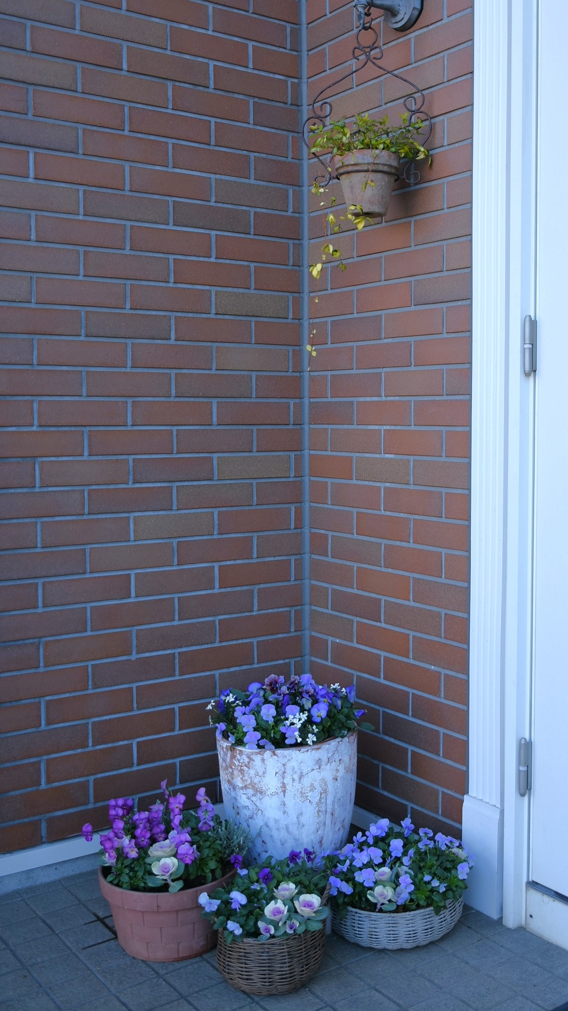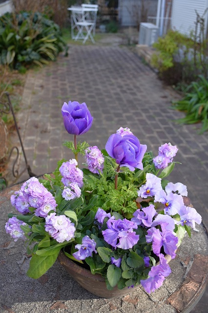 今はこんな感じです。左のピンクの寄せ植えは別の場所に移動し、カゴの寄せ植えは母にプレゼントし、リースは解体して寄せ植えにしました。そして、園芸店でアネモネなどを買って、こげ茶色の鉢に寄せ植えしました。右端です。