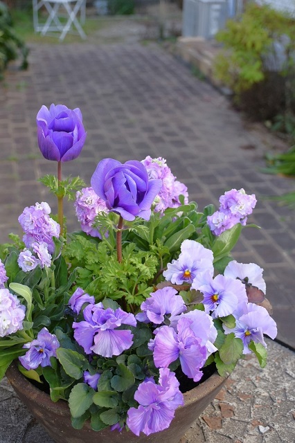 ガーデンテーブルの上に置くと、寂しい冬の庭に、そこだけ春が来たような華やかさです。