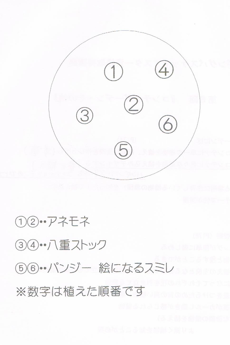 植え付け図はこちらです。アネモネは後ろに高さのある苗、前に少し低めの苗を配置します。選ぶ時は茎の付け根に新しい花芽があるものを選ぶと、次の花が、すぐに咲いてくれます。ストックは茎が何本か伸びているスプレー咲きのものを、パンジーは花付きの良いものを選びます。
