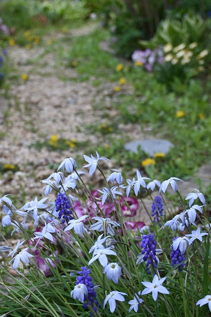 スイセンやムスカリ、ハナニラは庭のイロイロな場所で増えまくって、元気に咲いています。黄色いタンポポもね。