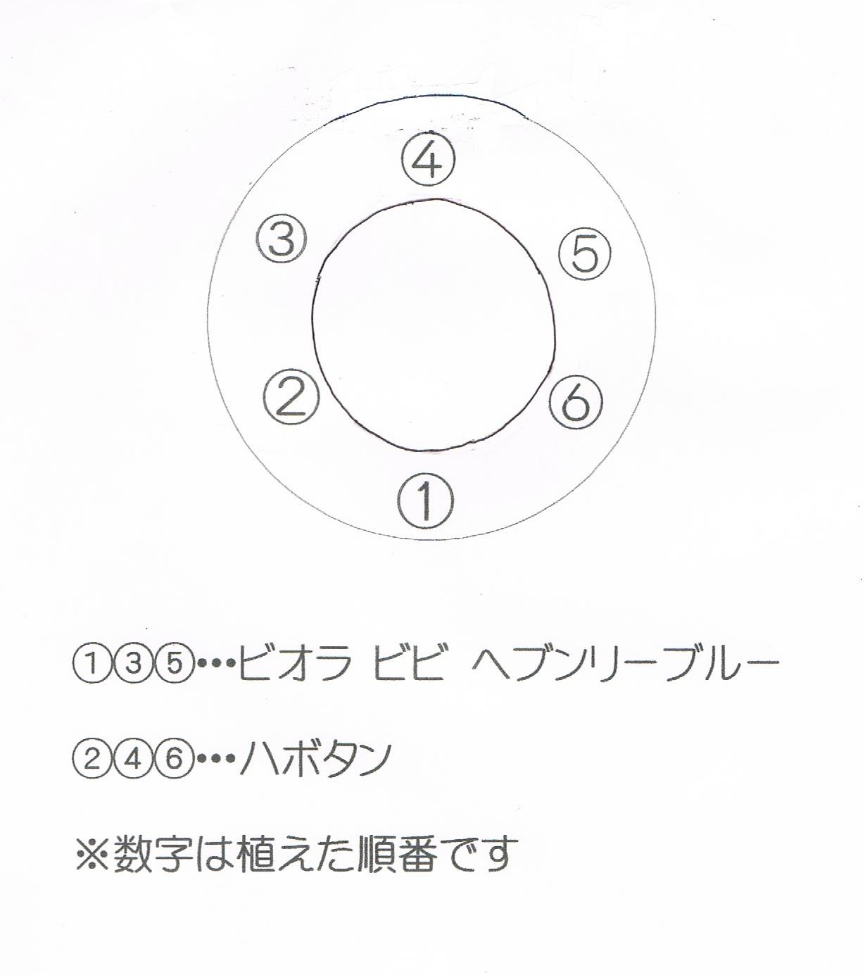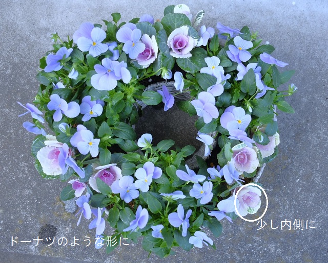 植え終わったら上から見てチェックです。ドーナツのような形になるよう、花や茎を少し切ったり、植える位置を調整すると出来上がりが綺麗になります。