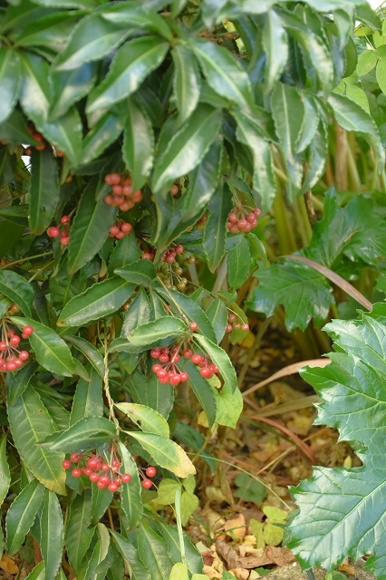 ガーデンチェアの足元のマンリョウが、たくさん実を付けていました。縁起が良いわぁ。アッと言う間に新年が来そうです。