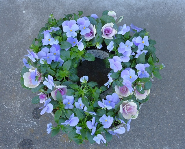 とても簡単に作ることができます。園芸店で販売している直径30センチのリース型を使いました。内側に貼ってあるビニールに水抜き穴を3か所開け、ビオラ→ハボタン→ビオラ→ハボタン→ビオラ→ハボタンの順に3ポットずつ、計6ポット植えただけです。土の見える部分には水ゴケを敷いて乾燥を防ぎ、土が流れ出ないようにしました。
