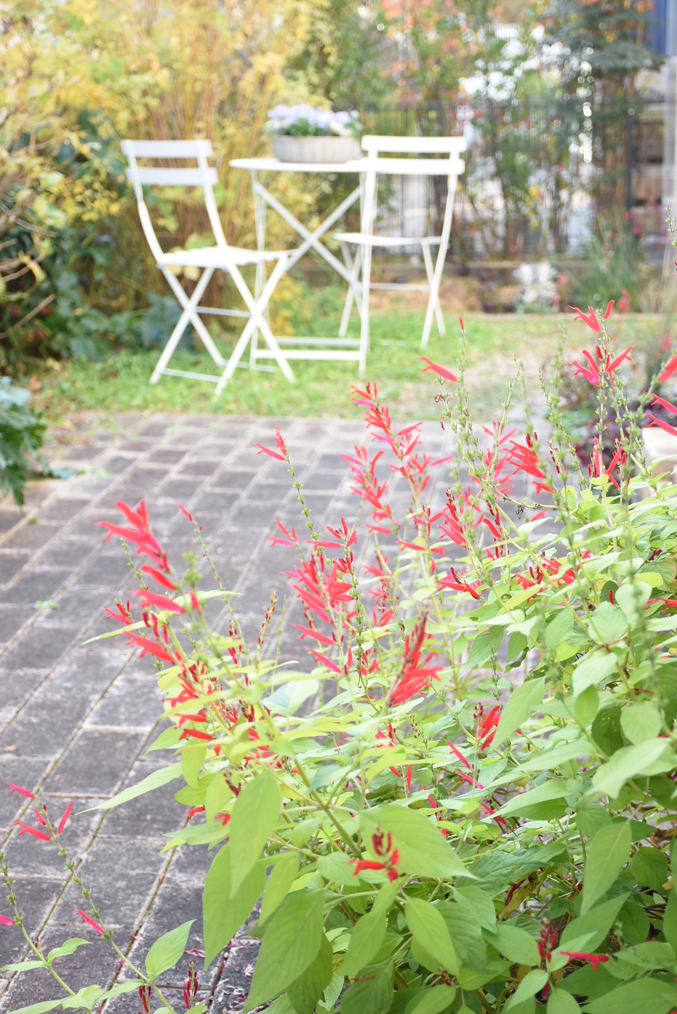パイナップルセージがまだ咲いて、庭が華やかです。来年の秋が楽しくなるように、サルビアやキクの苗もいくつか植えました。