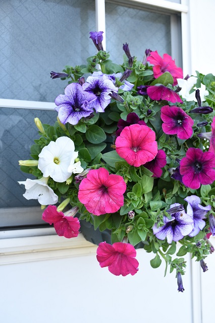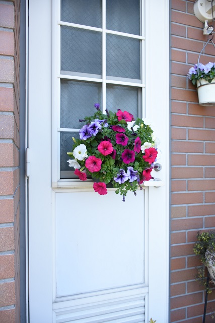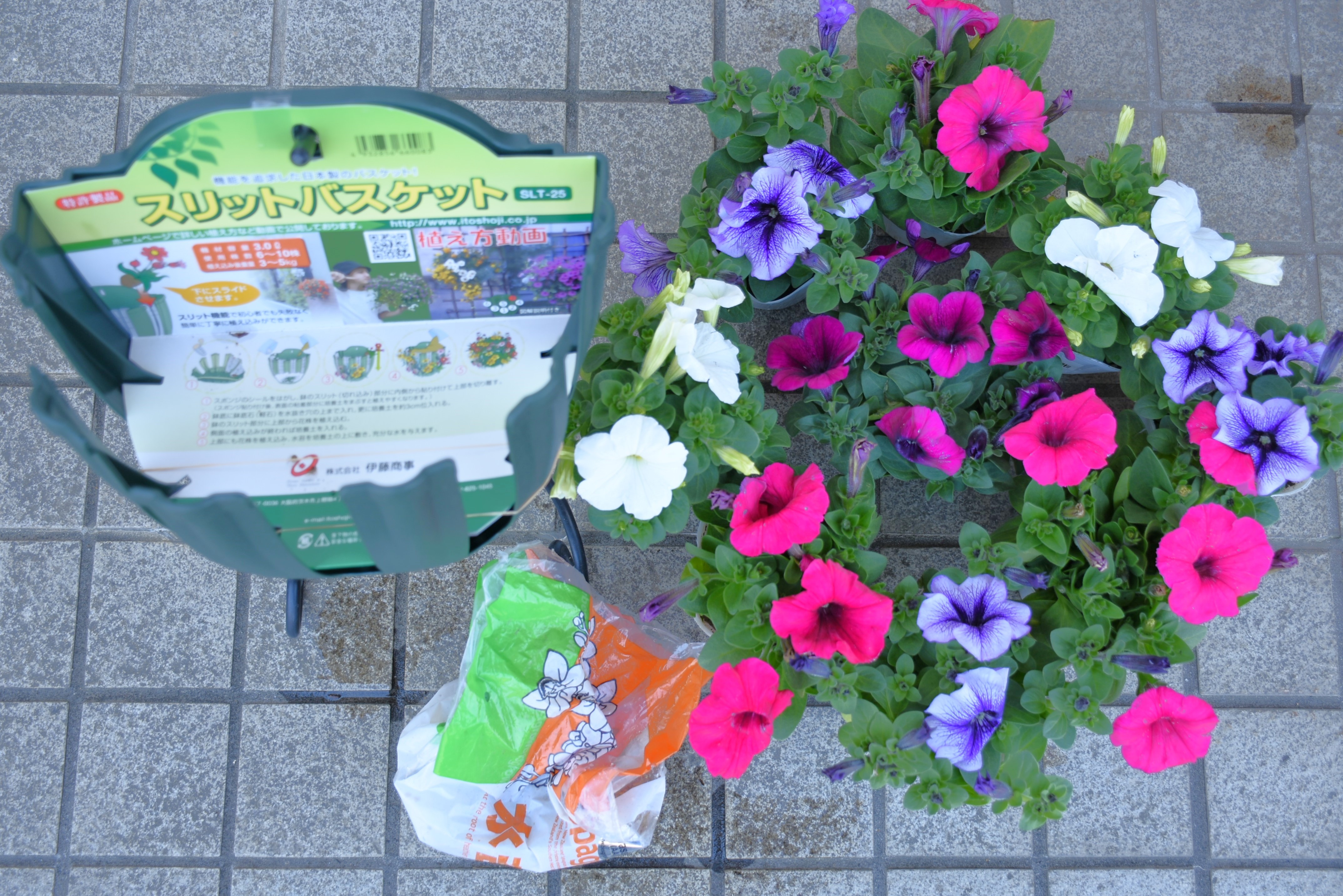 先日ホームセンターに行ったら98円のペチュニアがありました。しかも花付きが良くて。嬉しくなってハンギングバスケット用に苗を買ってしまいました。園芸店に勤めているのにね。