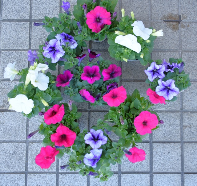 こちらです。(下から植える順に並べてあります)全部ペチュニアで、紫×3,濃いピンク×3、濃い赤紫×1,白×2です。