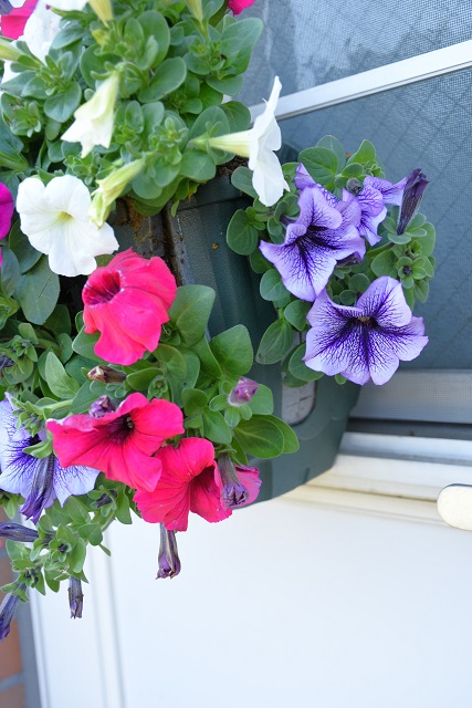 右から。紫色のペチュニアが少々小さい苗でしたので、容器が結構見えます。