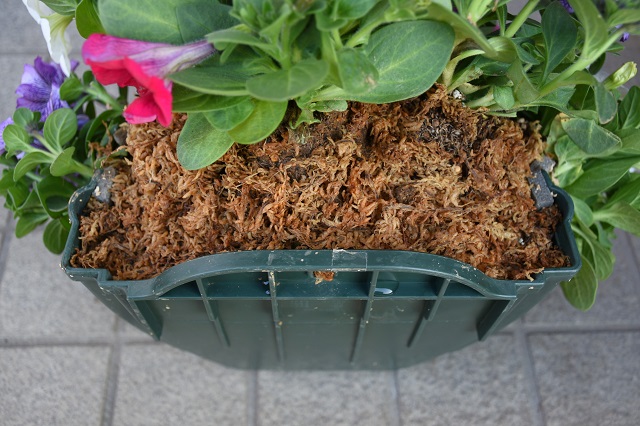 上部はこんな感じです。土を入れ終わったら土が流れ出ないよう、上部に水ゴケを敷きます。最初の水やりの時は、この水ゴケのところに活力剤を入れた水をたっぷりとかけます。そして2週間もするとこの水ゴケの部分も徐々に隠れてきます。