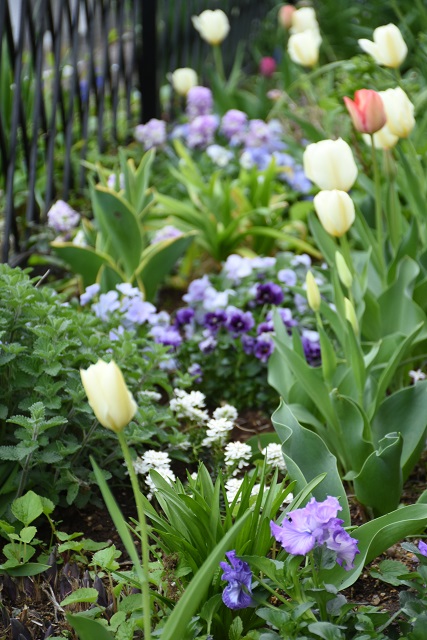 毎年、こんなふうに春になると鉢植えのビオラを地植えしています。庭植えするとなぜか、花ガラが気にならなくなるのです。水やりも鉢植えほど気にしなくても済みます。